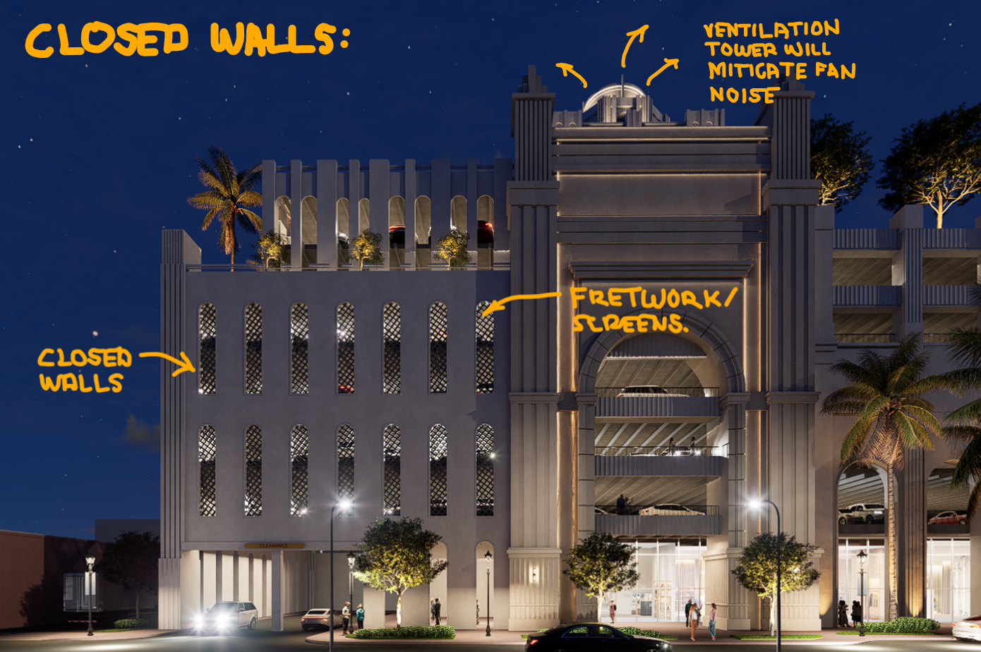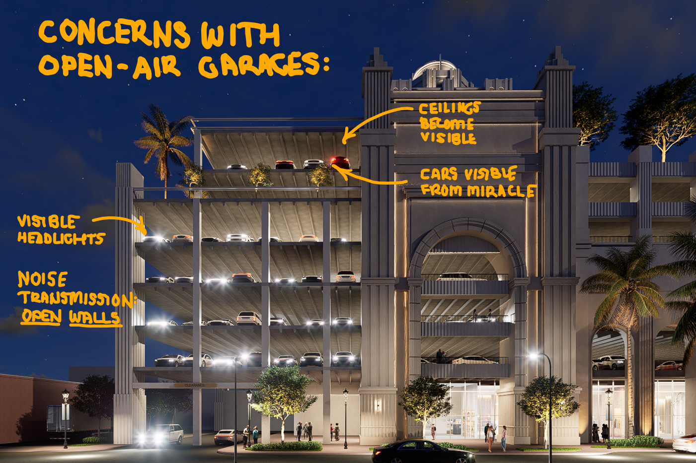 As cars ply through the inclined aisles and turns ninety-feet above the pedestrian surface, Headlights of vehicles will be clearly visible from Miracle Mile. Visible from residential areas, open-air garages can even produce sound. Without walls to mitigate sound, vehicle tires could be heard from street level.