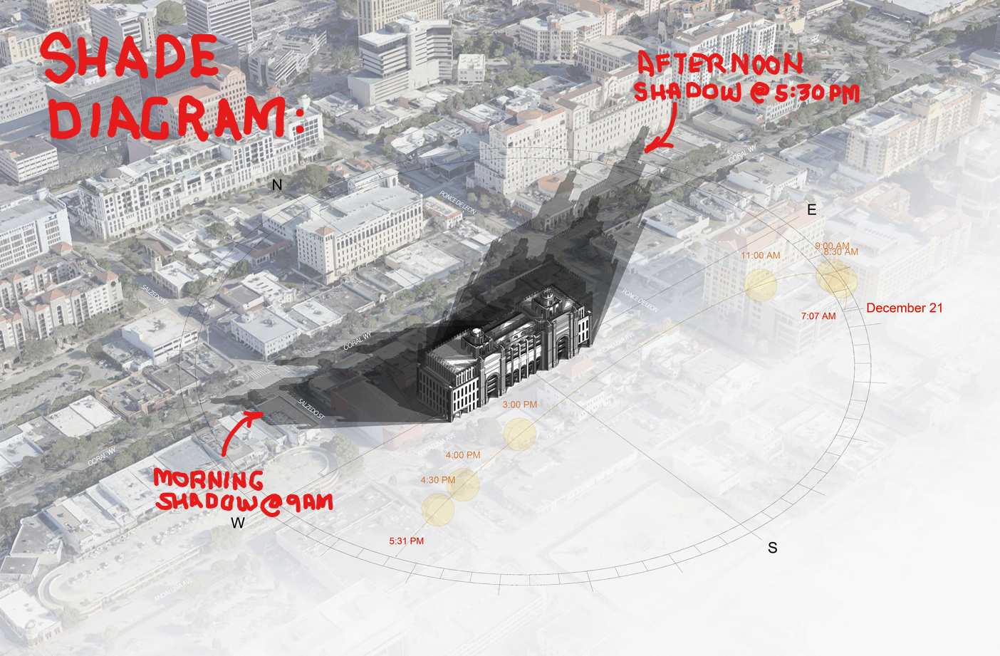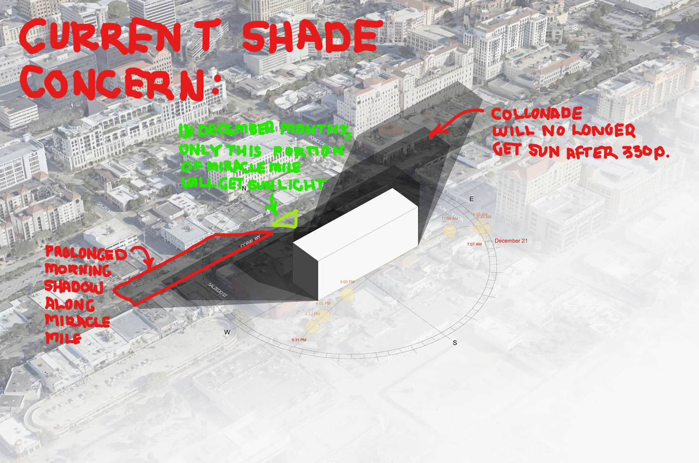 Our models indicate the current design for the Mobility Hub would cast a shadow extending beyond Miracle Mile, and reaching as far as Aragon Avenue during the Holiday season. The current design would reduce sunlight as much as 2-1/2 hours per day on some portions of Miracle Mile. The public should understand reducing sunlight for this period of time adversely impacts the sub-tropical trees, vegetation and planting material that currently line Miracle Mile. It is important to understand Native planting materials are especially reliant on sunlight for their health.