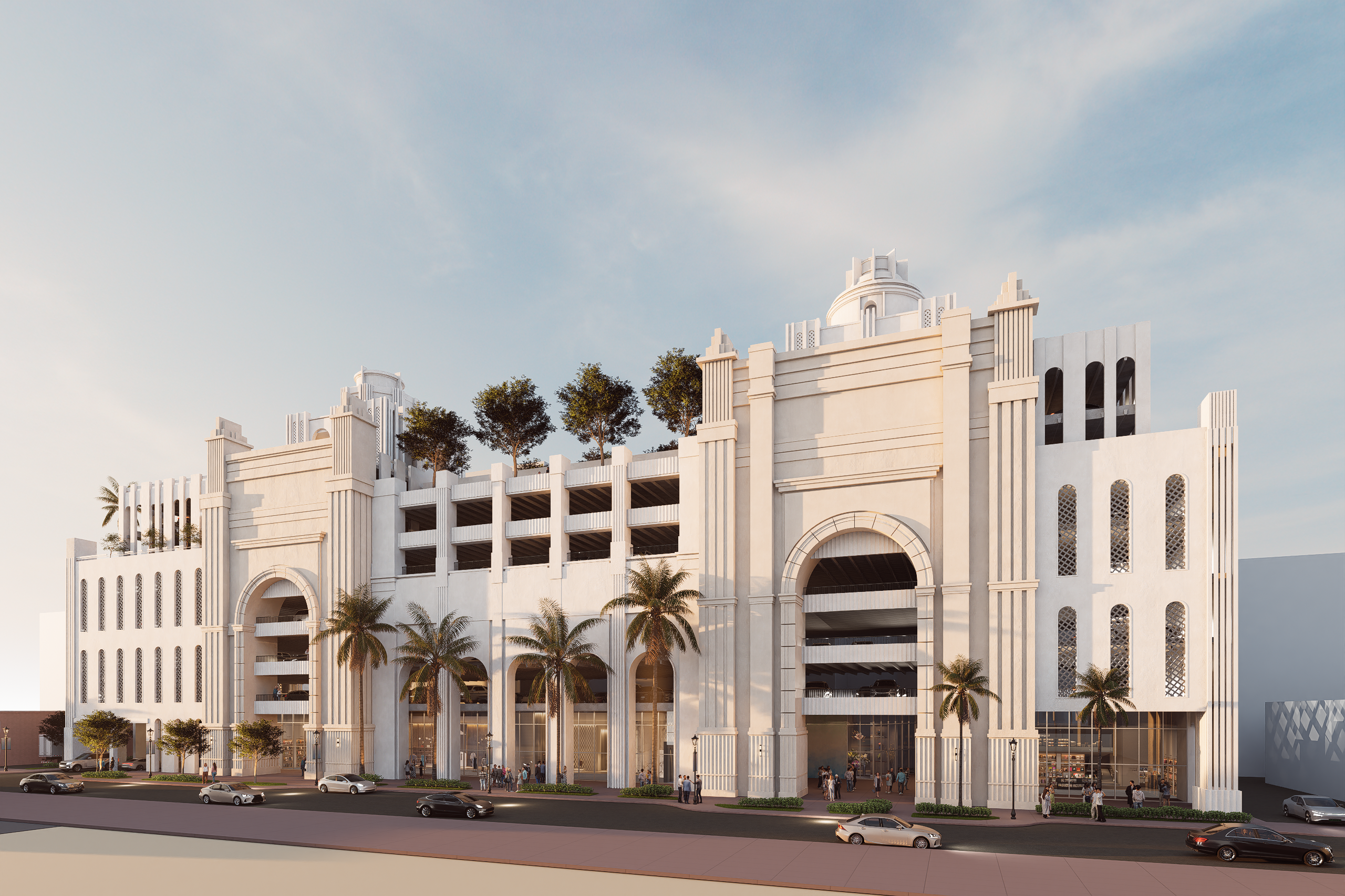 City planners developed a program for 600 cars. Through using a stepped massing, possible with Art Deco and Mediterranean Architecture, we re-scaled the building so it relates more naturally to its surroundings, turning what could be a monolithic International-Style garage into a warming civic building that breathes into the city it was designed to support.